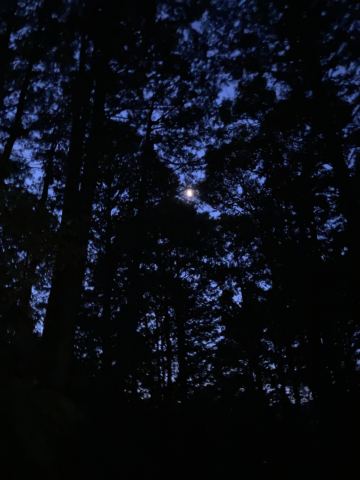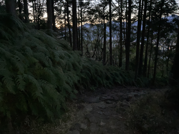 街灯もない山道。日の出の1時間以上前なのでまだ真っ暗です。月明かり・星明り・足元を照らすヘッドランプの明かりで進みます。