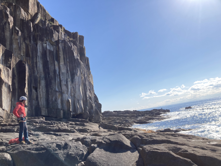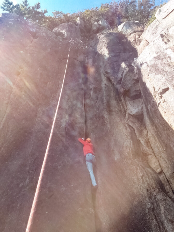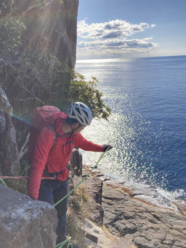 15時、まだ余力を残して帰路につきます。なぜなら朝、懸垂下降で降りた崖を登って帰らなくてはいけないから。しかも難しいルート。2ピッチのマルチピッチで登りました。