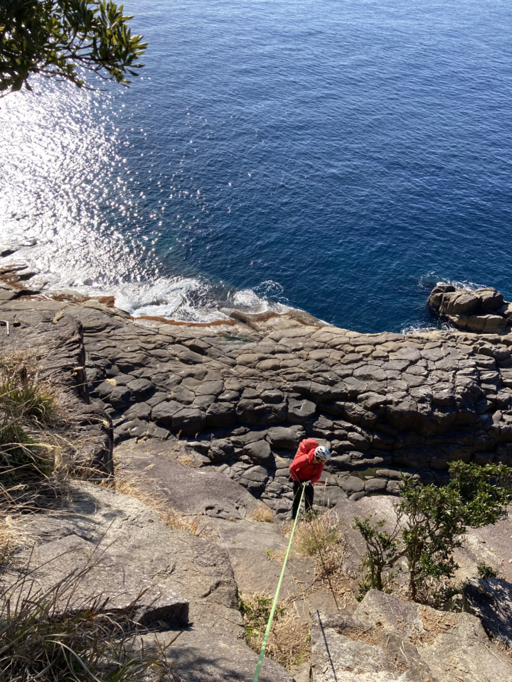 懸垂下降で崖を降ります。