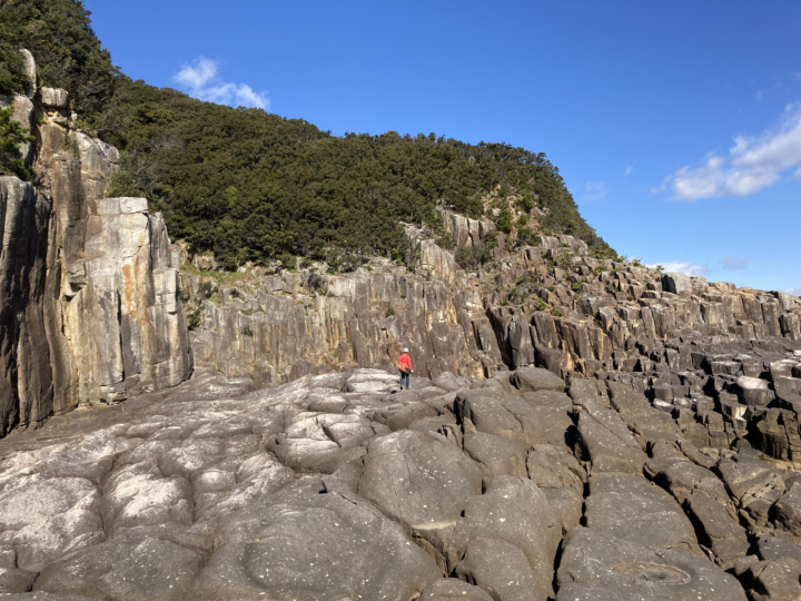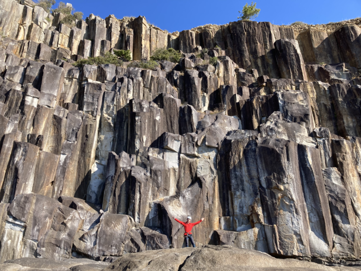 『柱状節理』の岩場。溶岩が冷えて収縮するときに柱のような形が形成されるそうです。