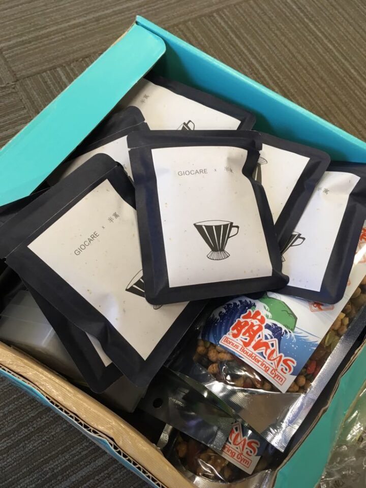 開けてみたら、花蓮にあるコーヒーショップ「半寓」のドリップコーヒーがいっぱいと、ナッツ、シール、そしてタイの新しいトポ本が入っていました!