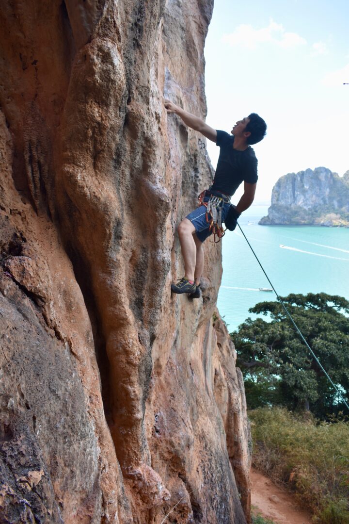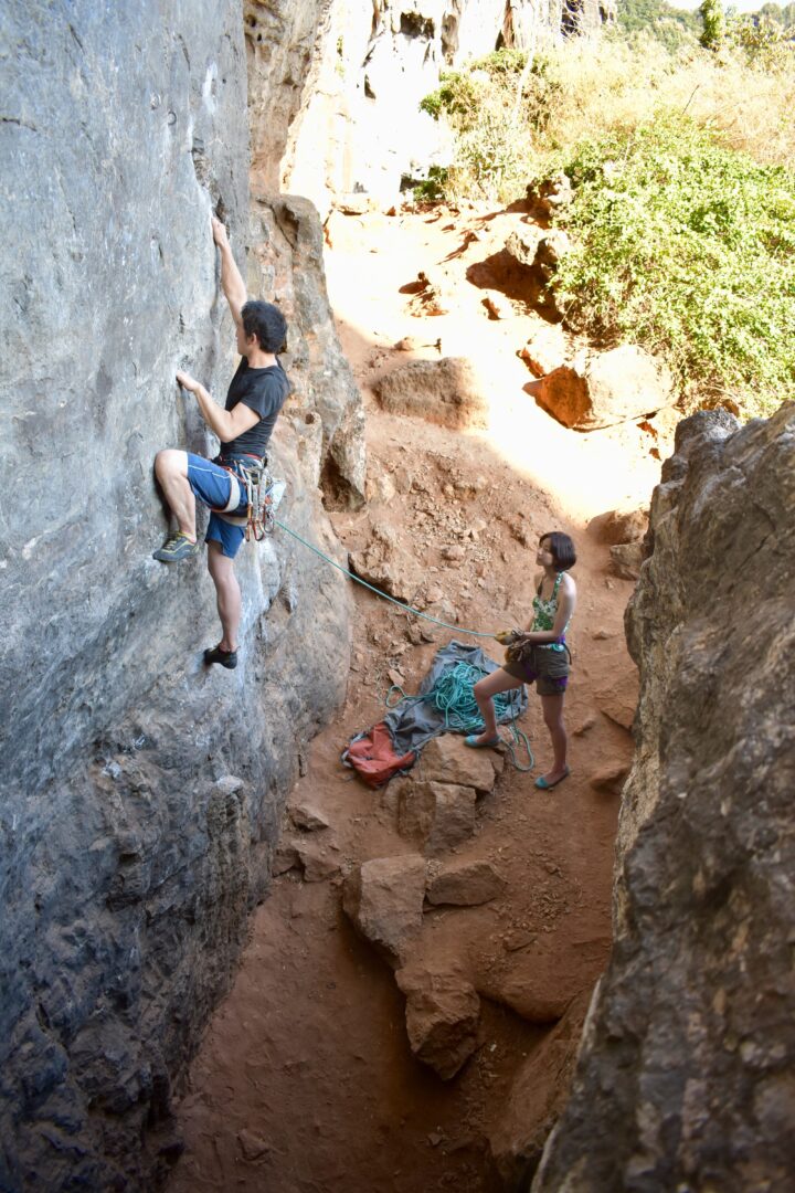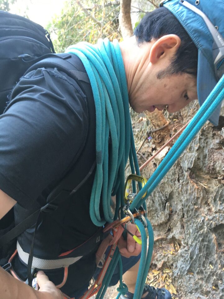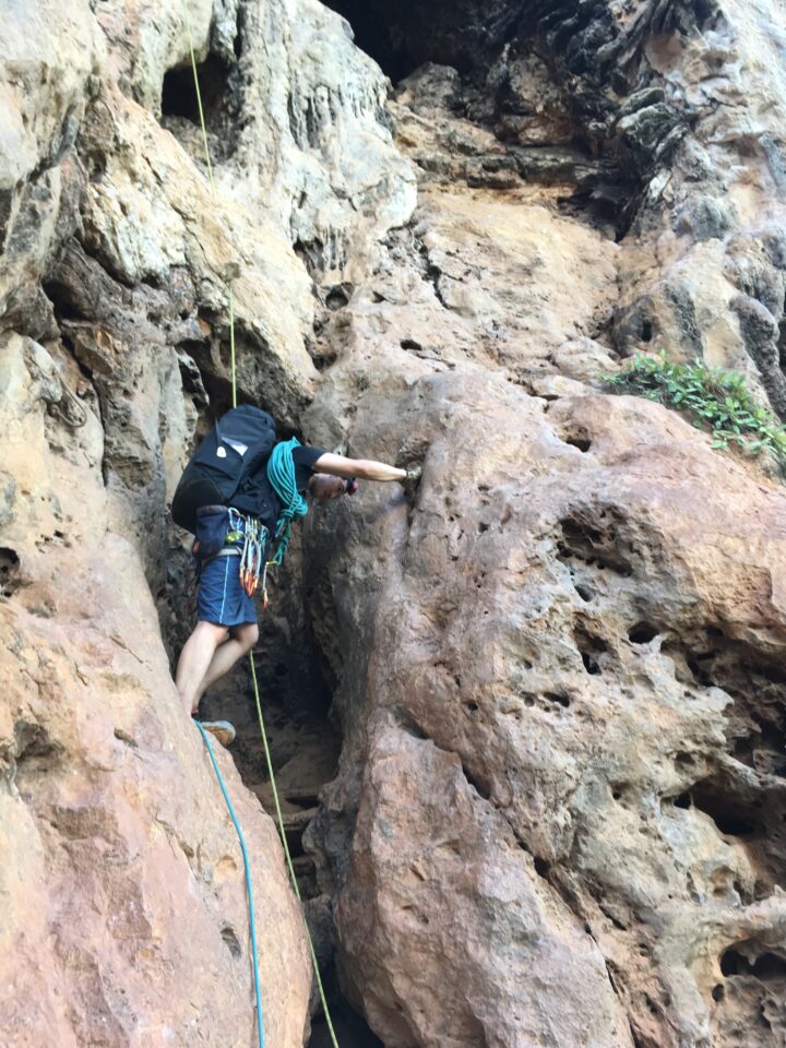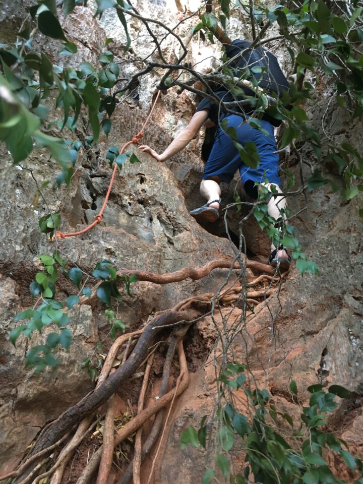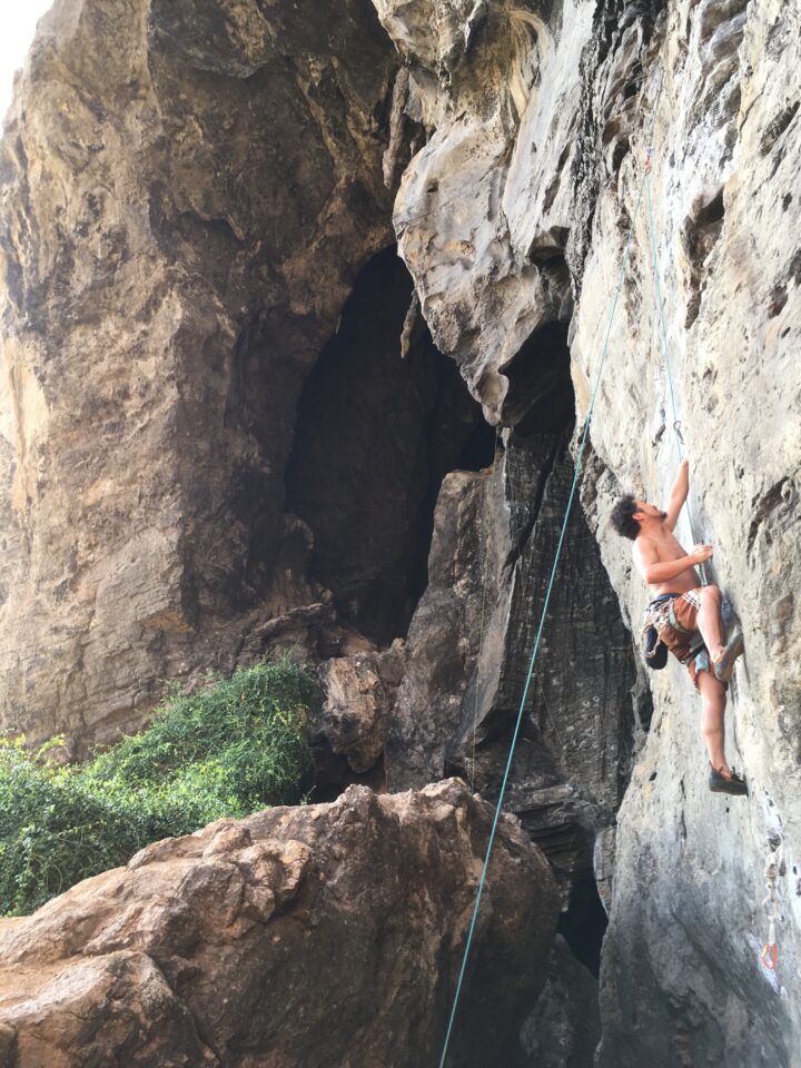 いちばん暑い時間帯を海で過ごしたあとは、再び洞窟へ。あの写真映えする洞窟出口のルートを登りに行きました。でもまだ前のグループが登っていて終わる気配がなかったので、近くのルートを1本登って本日のクライミング終了。