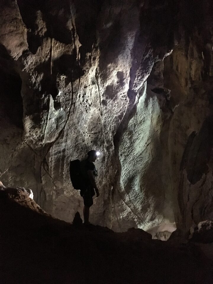 ユウさんの右上の黒い部分が洞窟の入り口。ユウさんが私たちの命綱と荷物をもって先導してくれます。