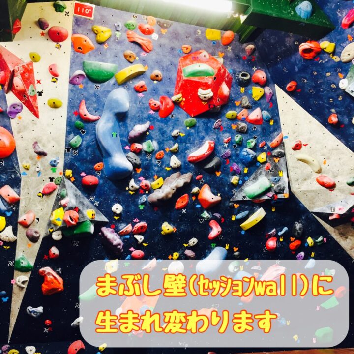 セッションウォールと言うのは、ホールドがびっちりついてる壁のこと。みんなで課題を作りっこしてワイワイ登る(セッションする)からセッションウォールと言います。お餅にきな粉をまぶすように、壁にホールドをまぶしているように見えるので「まぶし壁」とも呼ばれます。