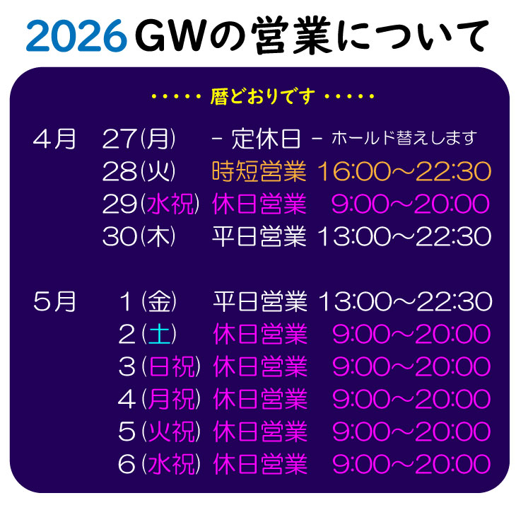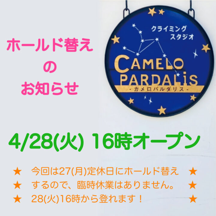今回は27(月)の定休日にホールド替えを行うので、臨時休業はありません。28(火)16時から登れますので、遊びに来てね! スラブ・垂壁・120°が新しくなりますよ!