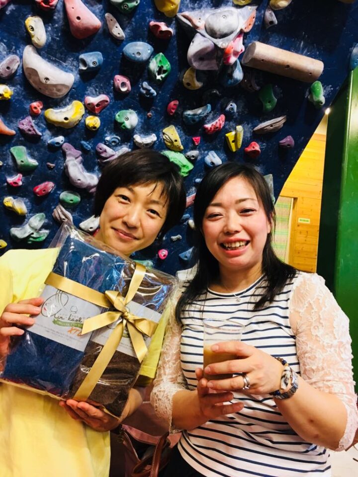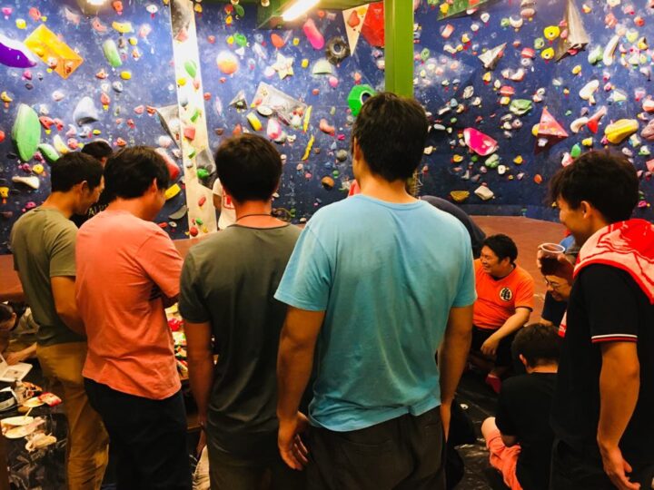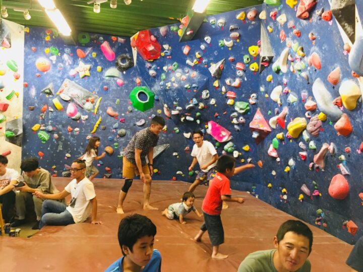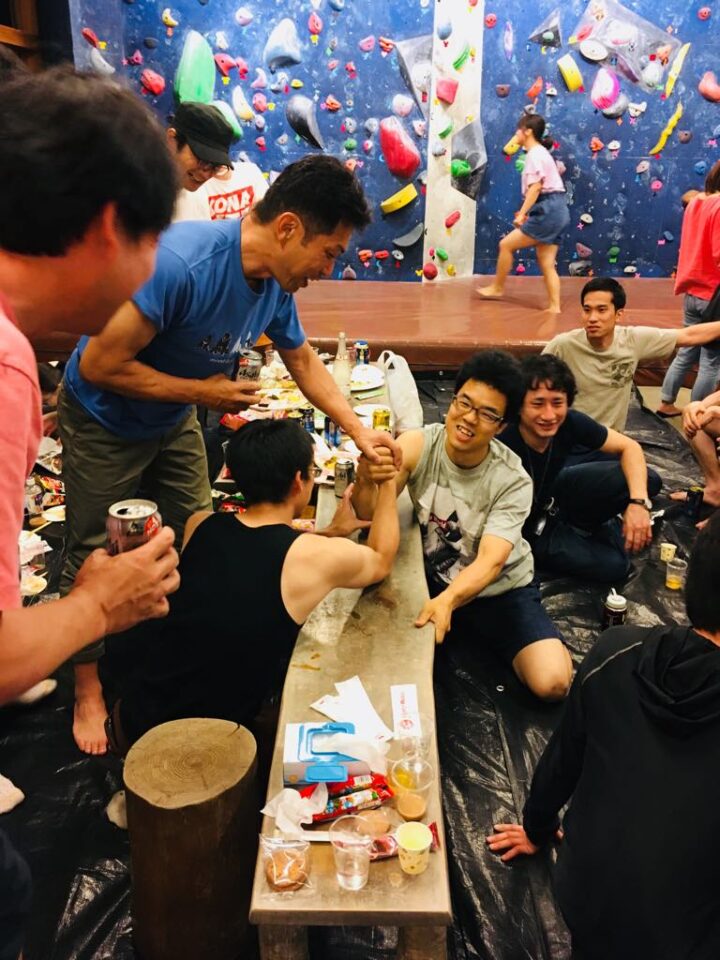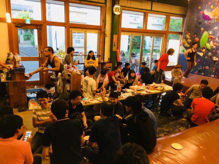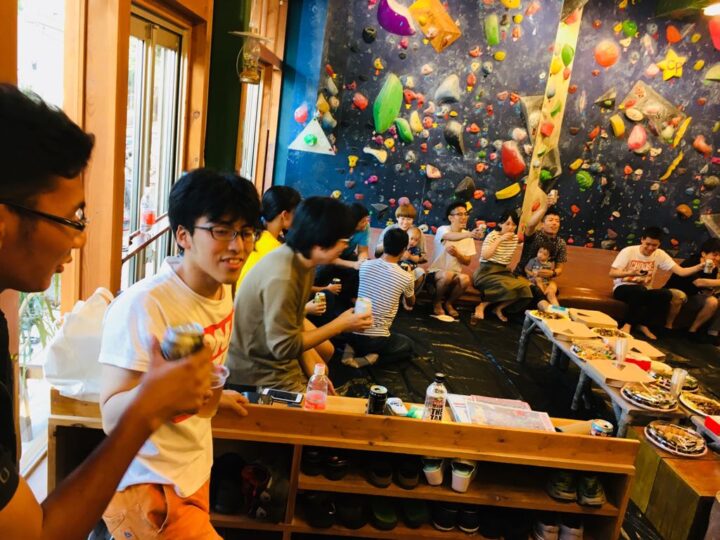 マットの上を駆け回る子供たちと、お酒&おしゃべりを楽しむ大人たち。クライミングジムって「顔は知ってるけど話したことがない」という人がいっぱいいるんですよね。パーティーのいいところはそんな方たちと飲みながら話せること。交友関係が広がって、クライミングがまた楽しくなります。