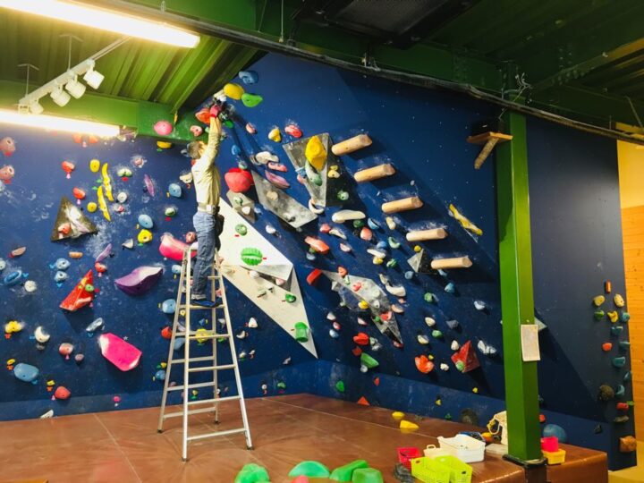 ユウさんとキヨコで黙々とセッティング。このホールドは右手で持てばグー、このホールドは足をあっちに張ればしっかり持てるぞ、などと考えながら付ける作業は、大変だけど楽しいものです。